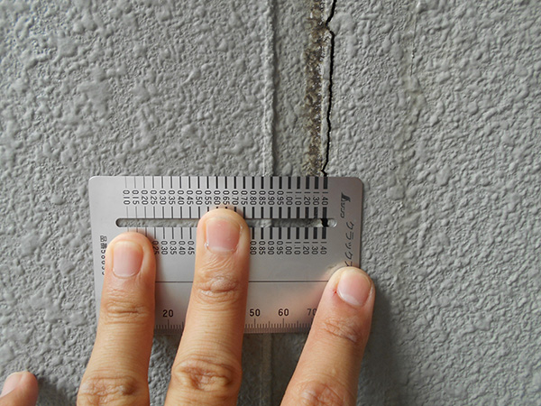 外壁にひび割れ(クラック)が発生している状態です。特に幅が0.3mmを超えるひび割れは、雨水の浸入経路となり、内部の建材腐食や構造的な問題を引き起こすリスクがあるため、早急な補修が必要です。