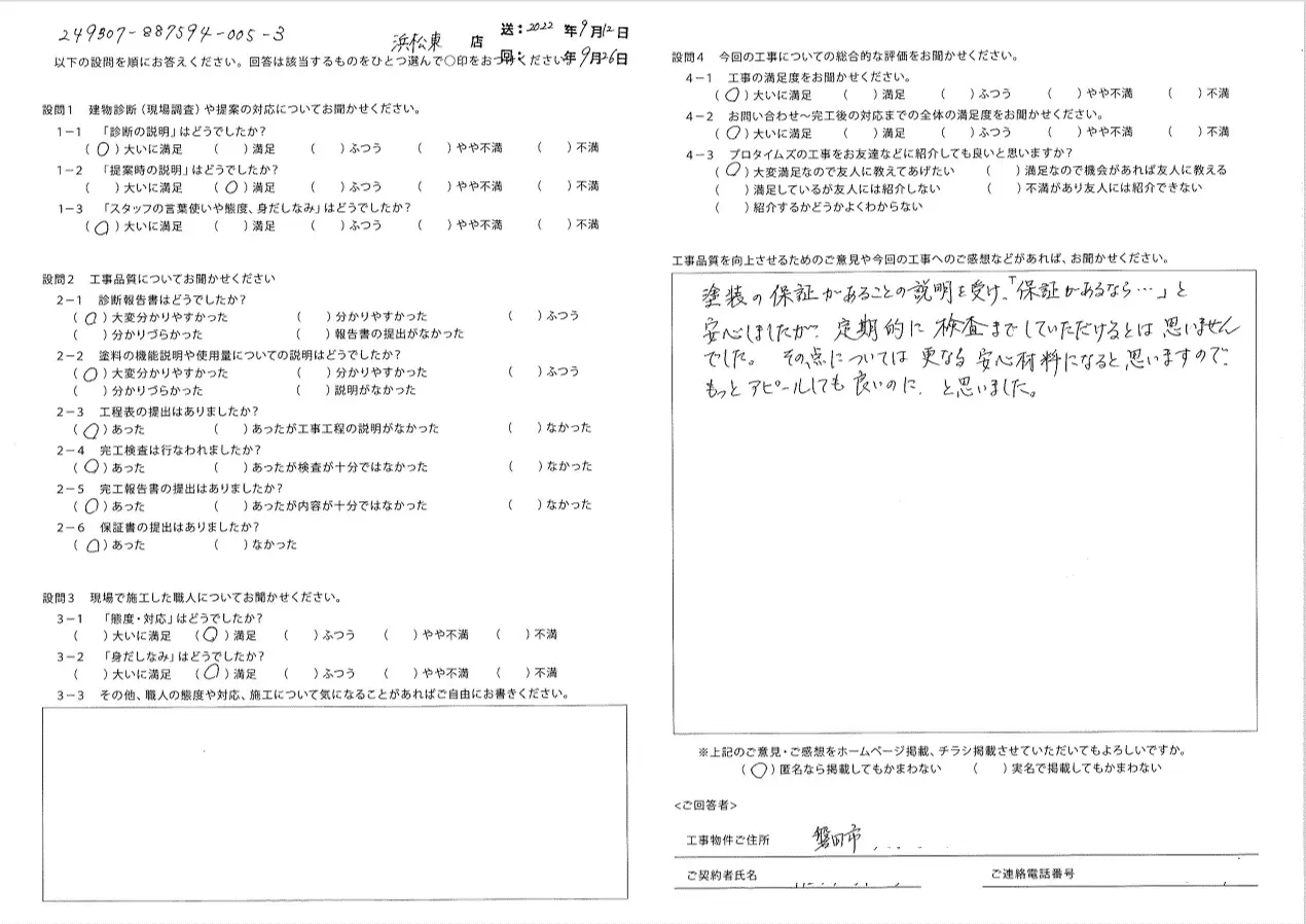 塗装の保証があることの説明を受け「保障があるなら・・・」と安心はしましたが、定期的に検査までしていただけるとは思いませんでした。