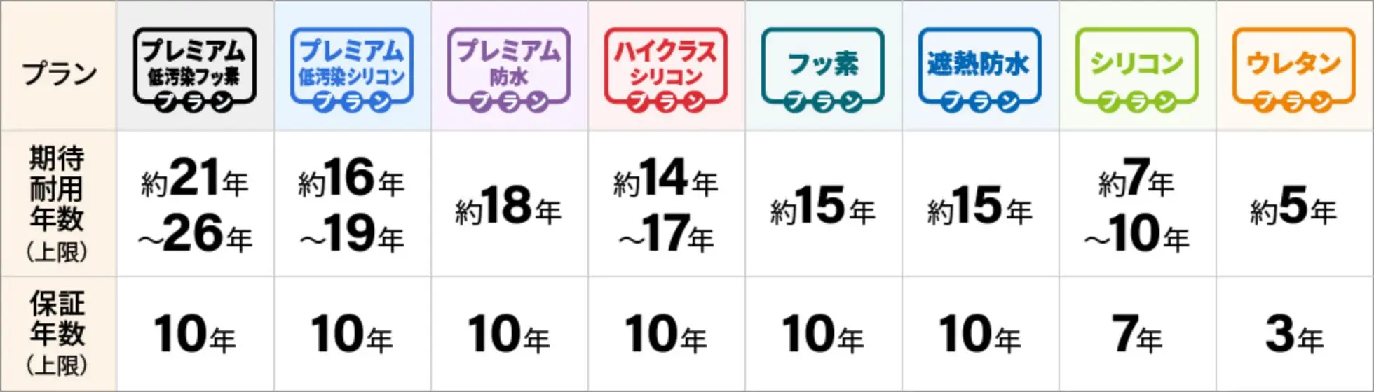 外壁塗装プランの保証一覧