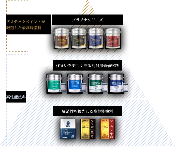 超高性能塗料”プラチナシリーズ”は、アステックペイントの塗料の中でも住まいを永く守り続けるために厳選された最高峰塗料ラインナップ。