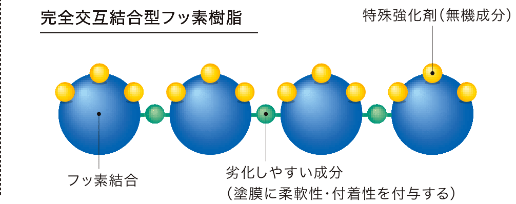 規則的な交互結合のため結合力が強く紫外線による劣化を抑える「完全交互結合型フッ素樹脂」を採用。さらに、劣化に強い特殊強化剤(無機成分)をフッ素結合に固着させることで、さらなる高耐候性を実現。