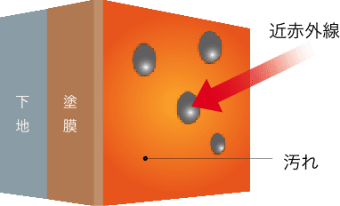 親水性(水になじみやすい性質)により、塗膜に汚れが付着しても、汚れの間に水が入り込み、汚れを洗い流す。